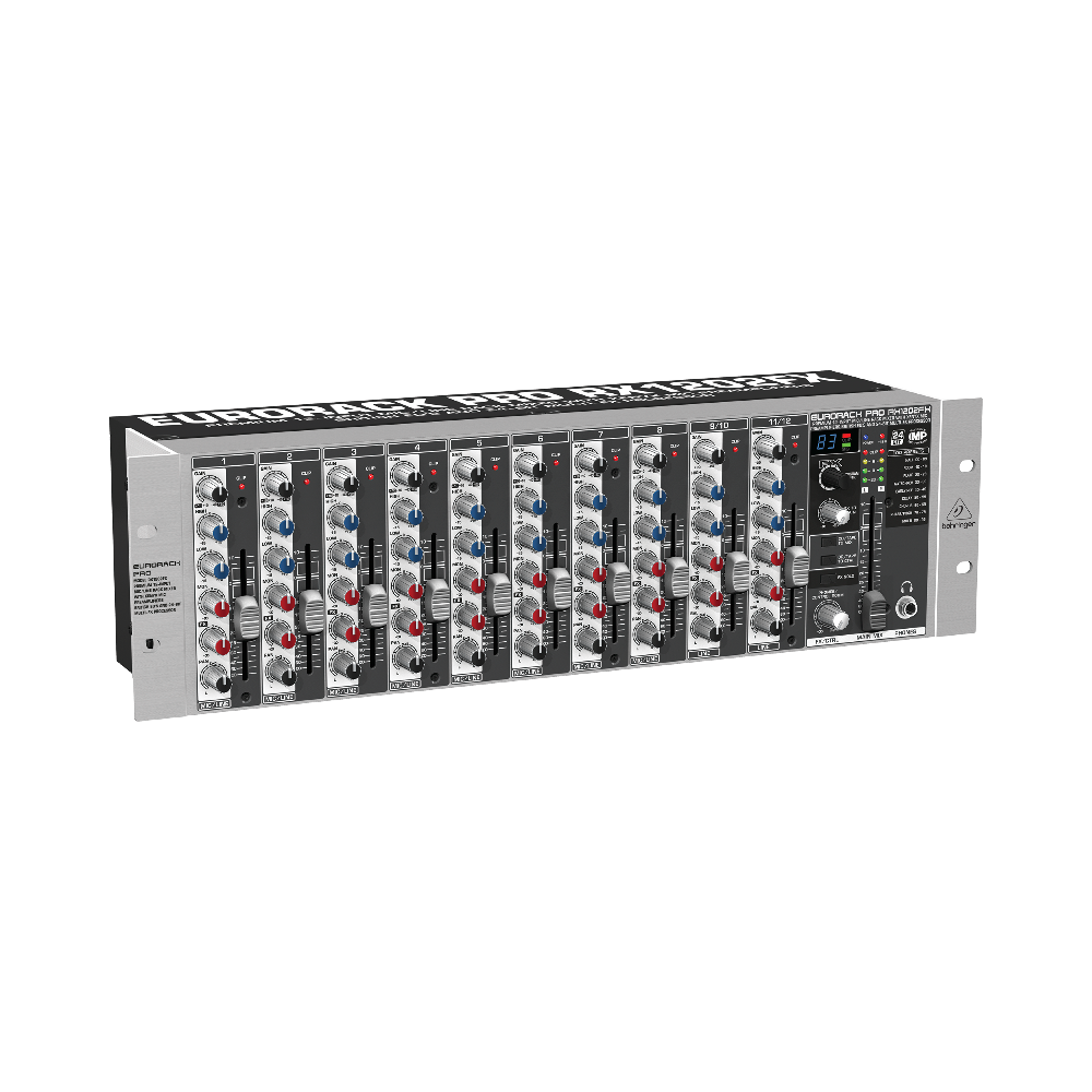 EURORACK PRO RX1202FX позволяет оперировать 8 монофоническими и 2 стереофоническими каналами. Входная секция расположена на задней панели корпуса. Помимо основных разъёмов там находятся гнёзда разрывов для моноканалов, к которым можно подключить компрессоры, предусилители и другое вспомогательное оборудование, восемь микрофонных входов, предусилители для которых уже встроены в EURORACK PRO RX1202FX, и вход 2-Track. Для подключения к микшеру конденсаторных микрофонов можно подать на входы фантомное питание 48 V. Инструменты настройки звучания включают в себя двухполосные канальные эквалайзеры, 60-миллиметровые логарифмические фейдеры громкости и регуляторы баланса. Все поворотные контроллеры являются герметичными, что позволяет избежать «расстройки» во время эксплуатации. Избегать превышения уровня сигнала помогают индикаторы клиппирования. Для каждого канала предусмотрено по два посыла на шины: префейдерный, для выходов мониторинга, и постфейдерный – для встроенного или внешнего эффект-процессора.