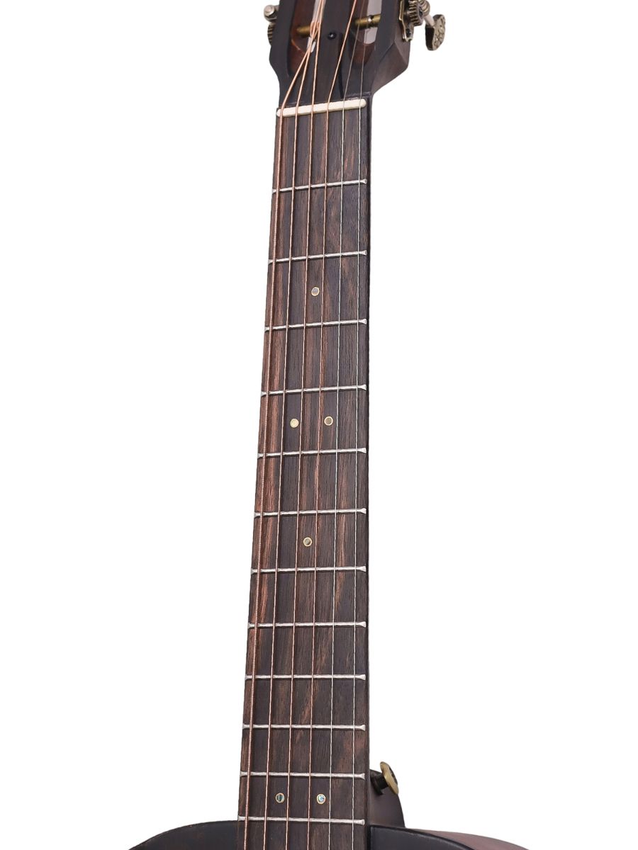 Bromo BAR6H hs — изысканная акустическая гитара в компактном корпусе Parlor. Цельные породы древесины обеспечивают богатый, сбалансированный тембр и долговременную стабильность инструмента при перепадах влажности и температуры. Компактный корпус Parlor удобен для игры сидя, путешествий и для музыкантов с небольшой комплекцией; даёт отчётливый, артикулированный звук с акцентом на средние частоты — идеален для пальцевой техники и фолк‑стилей. Двухсторонний анкер позволяет точно регулировать прогиб грифа под разные стили игры и калибры струн. Винтажные колки «Bromo» из античной латуни не только формируют ретро‑эстетику, но и гарантируют плавность хода и надёжность настройки. Матовая отделка подчёркивает текстуру дерева, тактильно приятна и не собирает отпечатков. Комплектация чехлом обеспечивает безопасную транспортировку и хранение. Bromo BAR6H hs — выбор музыкантов, ценящих аутентичное звучание, эргономичность и детализированный дизайн в винтажном стиле. Модель подойдёт как для домашнего музицирования, так и для сценических выступлений.