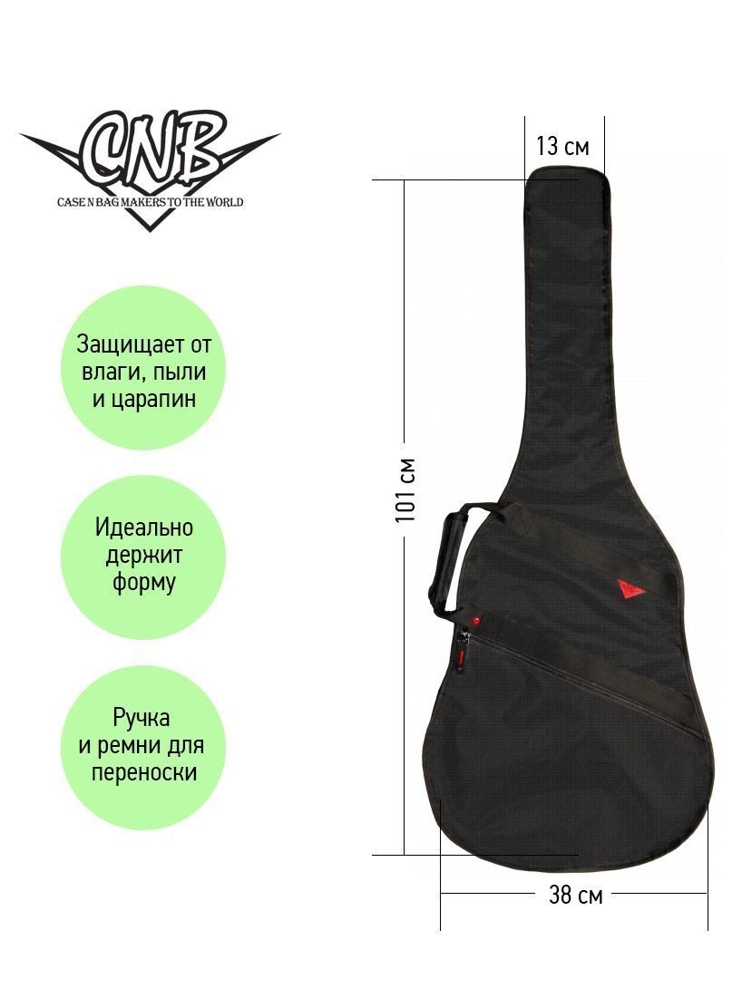 CNB CB380 – это стильный и качественный чехол для классической гитары. Главное назначение модели CNB CB380 – оберегать инструмент от внешних воздействий окружающей среды, которые негативно сказываются как на внешнем виде гитары, так и на ее звучании. Чехол изготовлен из водонепроницаемого нейлона плотностью 600 D без дополнительного утепления. Чехол закрывается на прочную молнию с крепкими зипперами. Модель имеет большой наружный карман для хранения нот и гитарных аксессуаров. Заплечные ремни позволяет с удобством переносить гитару за спиной. Для транспортировки инструмента в горизонтальном положении имеется прочная боковая ручка. Чехол CNB CB380 создан не только для надежной защиты инструмента, но и для вашего комфорта.