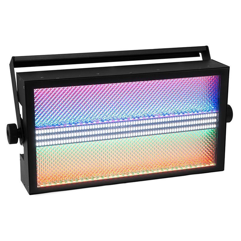 Led Star Strobe color – качественный светодиодный прибор, который включает в себя три независимых эффекта: стробоскоп, блиндер и рассеянный свет. Особенности модели Strobe color: – бесступенчатое смешение цветов RGB – 216 холодных белых светодиодов (SMD 5730) для динамических стробоскопических эффектов – 144 RGB-светодиода (SMD 5050) – индивидуальное управление RGB и холодными белыми светодиодами в режиме DMX – светодиоды RGB управляются в 1 или 48 сегментах в зависимости от режима DMX – частота вспышки 20 Гц – диммер – адресация и настройка через панель управления с 4-разрядным светодиодным дисплеем – управление звуком через встроенный микрофон с регулируемой чувствительностью – управление DMX512 возможно через любой контроллер DMX – выбор 7, 13, 22 или 148 каналов DMX – плоский металлический корпус со встроенными настенными держателями – светодиод: 216 х SMD 5730 0,5 Вт CW (ультраяркий) – светодиод: 144 x SMD 5050 3in1 TCL RGB (однородное цветовое сочетание) – управление звуком через микрофон