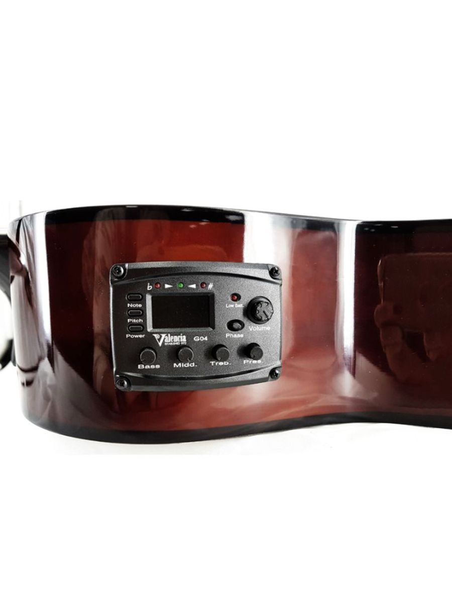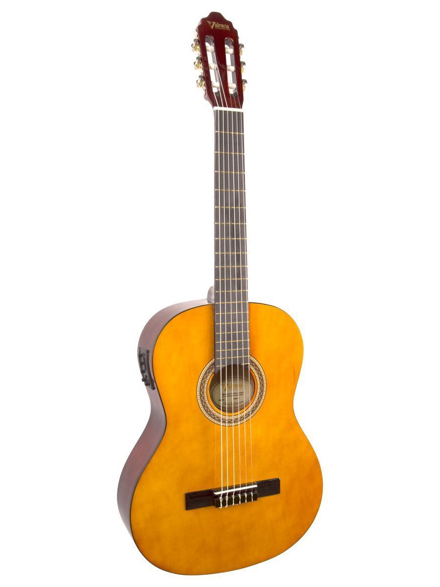 Электроакустическая гитара Valencia VC104E – качественный инструмент начального уровня, который можно легко использовать на сцене. Модель оснащена звукоснимателем с 4-полосным эквалайзером и качественным тюнером. Корпус гитары изготовлен из липы, которая обладает усиленными резонансными особенностями. Гриф выполнен из нато, накладка из клена, нижний порожек из махагона. Никелированные колки прекрасно держат строй. Нейлоновые струны, установленные на комфортной для игры высоте, делают гитару удобной даже для самых юных исполнителей. Натуральное покрытие сохраняет поры древесины открытыми, что значительно улучшает звучание инструмента. Valencia VC104E – отличная электроакустическая гитара по доступной цене.
