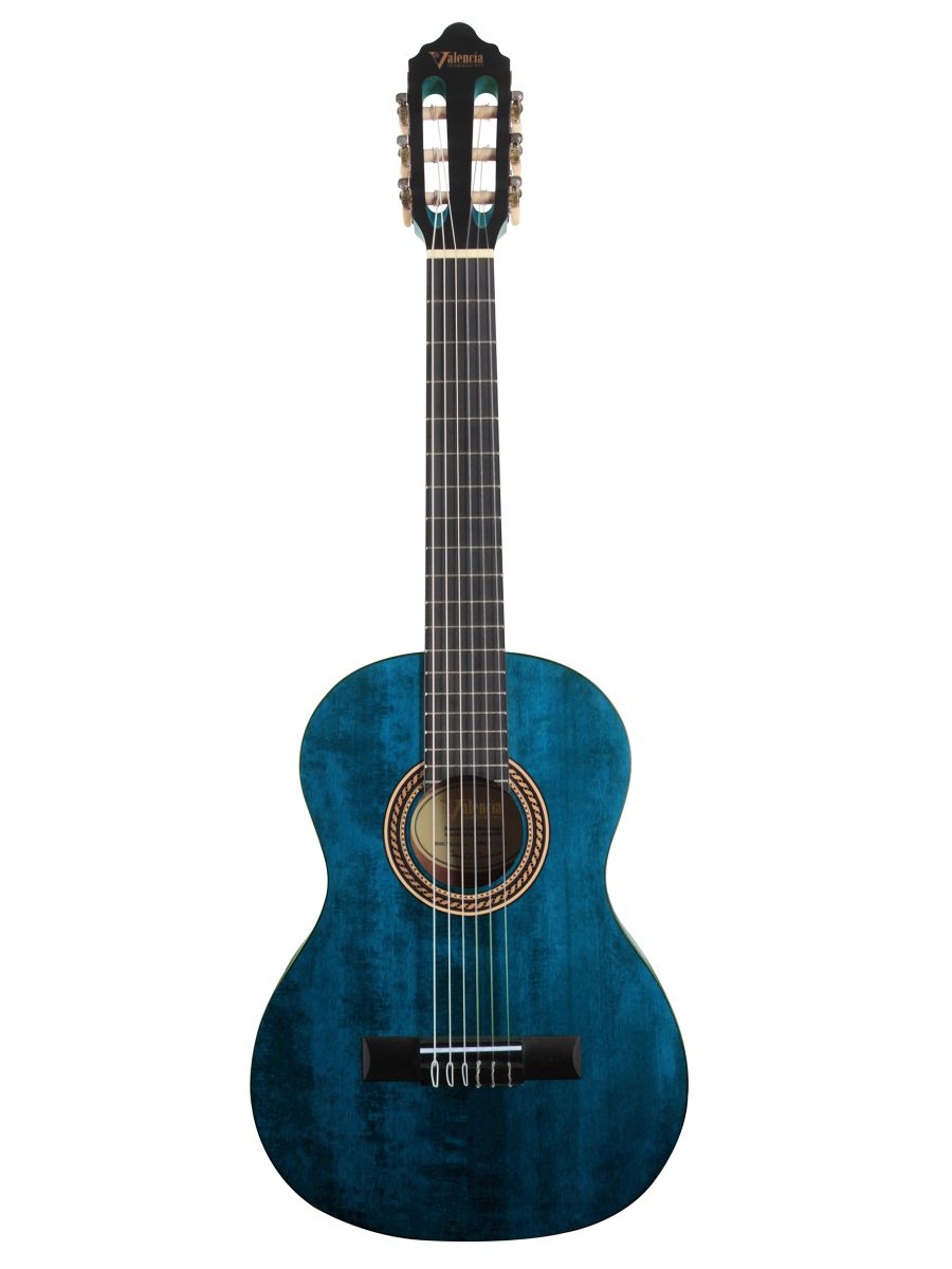 Valencia VC202TBU Гитара классическая 1/2, верхняя дека: ель, нижняя дека и обечайка: нато, гриф: махагони, накладка грифа и нижний порожек: махагони, колки: винтажные, никель, цвет Transparent Blue